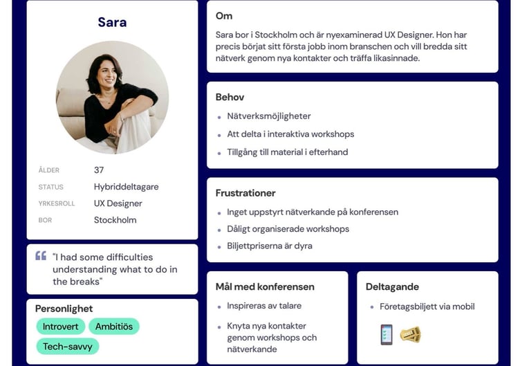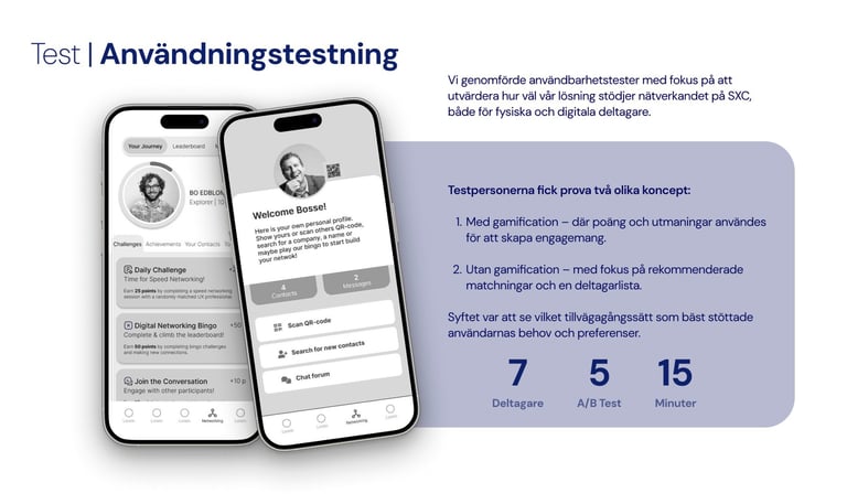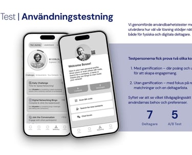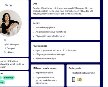 Our team developed a web app to improve networking and engagement at the Stockholm Xperience Conference, a hybrid event for UX designers. Applying User-Centered Design principles, I contributed to research, prototyping, and testing that uncovered key insights for creating a seamless user experience.