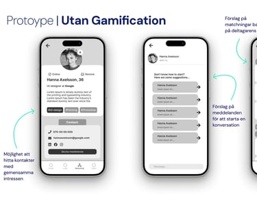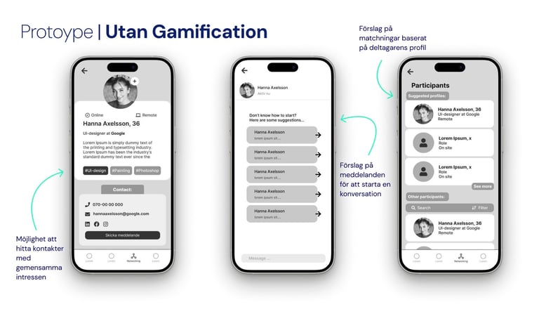 Non-gamified concept – participant list, suggested matches, conversation starters.